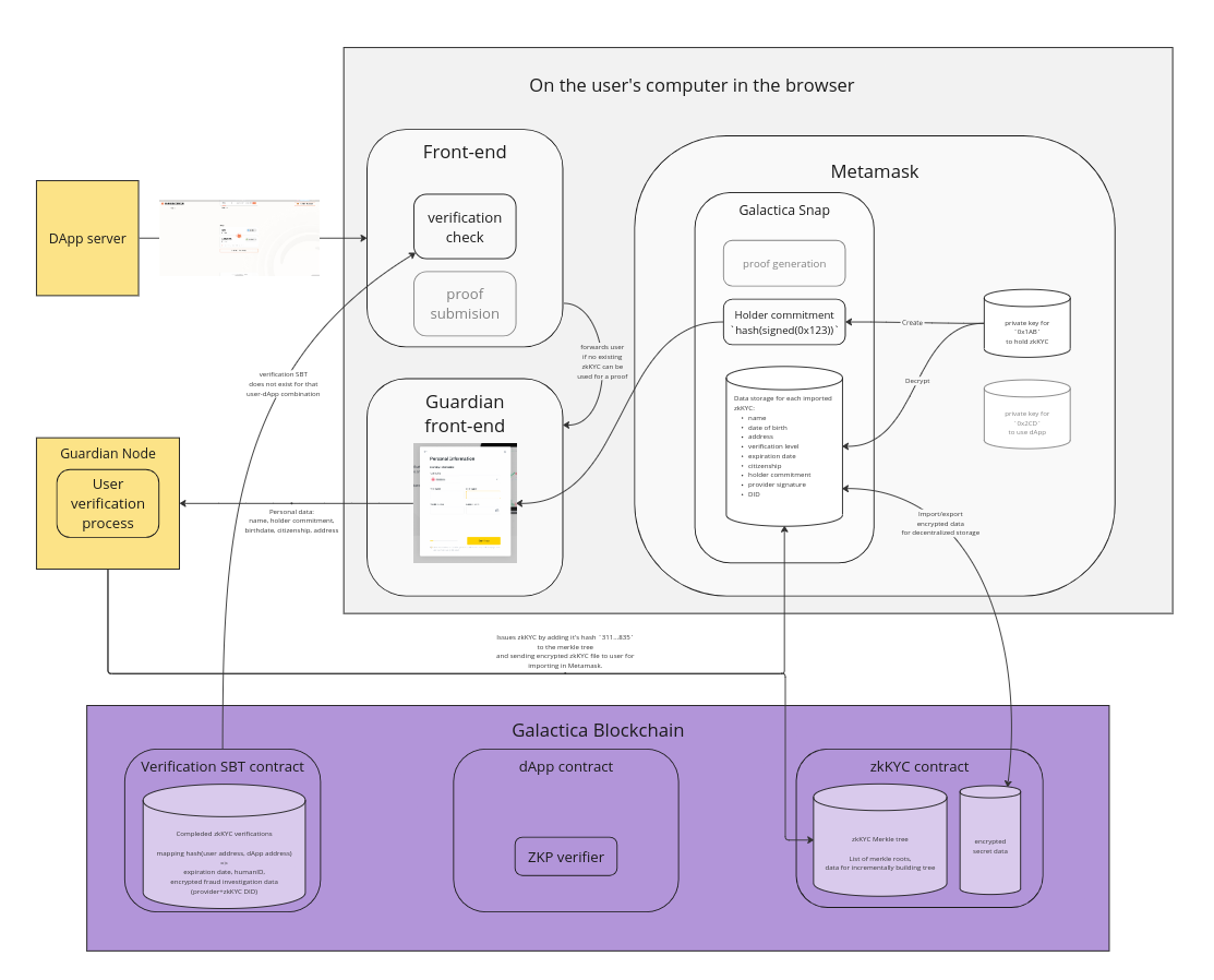 * User / Holder: The person that wants to prove being KYCed to use an on-chain DApp. The zkKYC is about the users personal details and managed in his self custody wallet ([galactica-snap-for-metamask](https://docs.galactica.com/galactica-developer-documentation/galactica-components/galactica-snap-for-metamask "mention")).